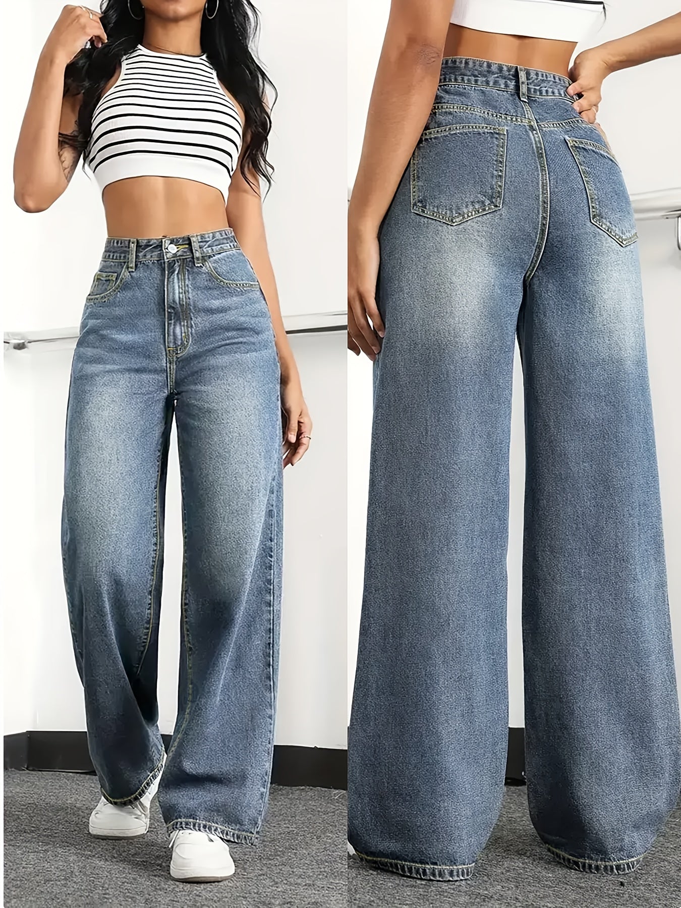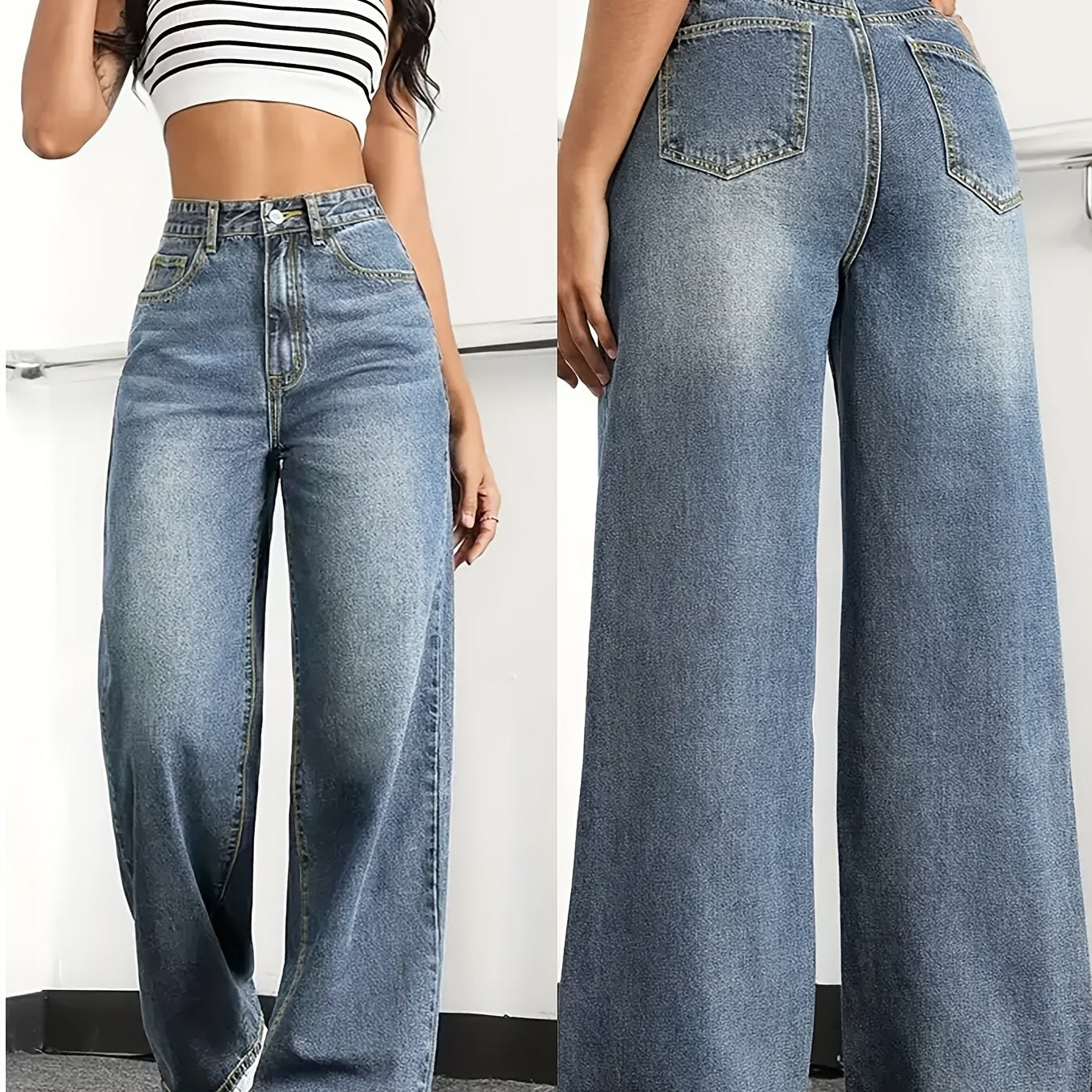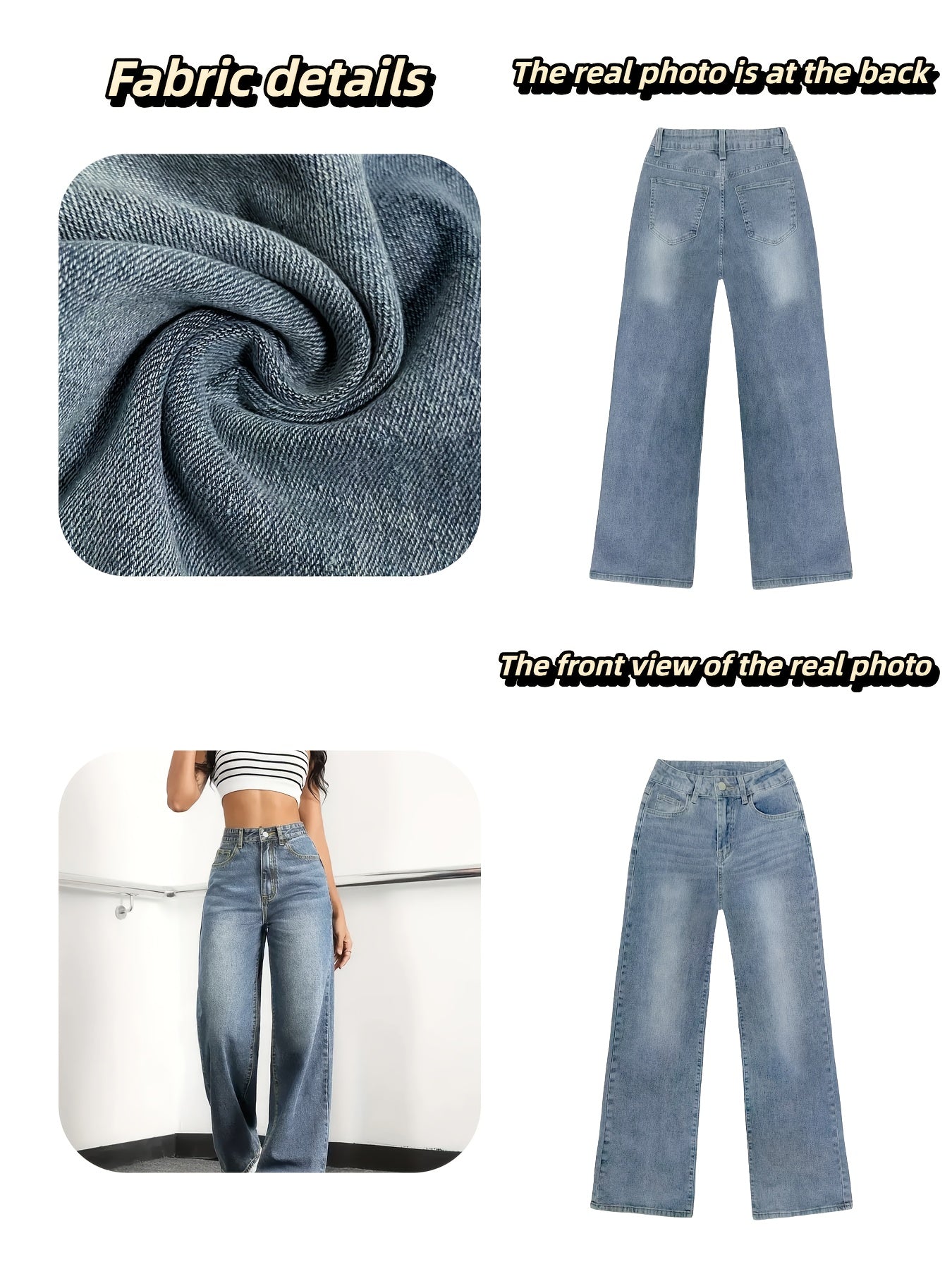 Jean femme taille haute coupe large , en denim doux (65 % coton, 33 % polyester, 2 % spandex) offrant une élasticité moyenne pour un confort optimal.