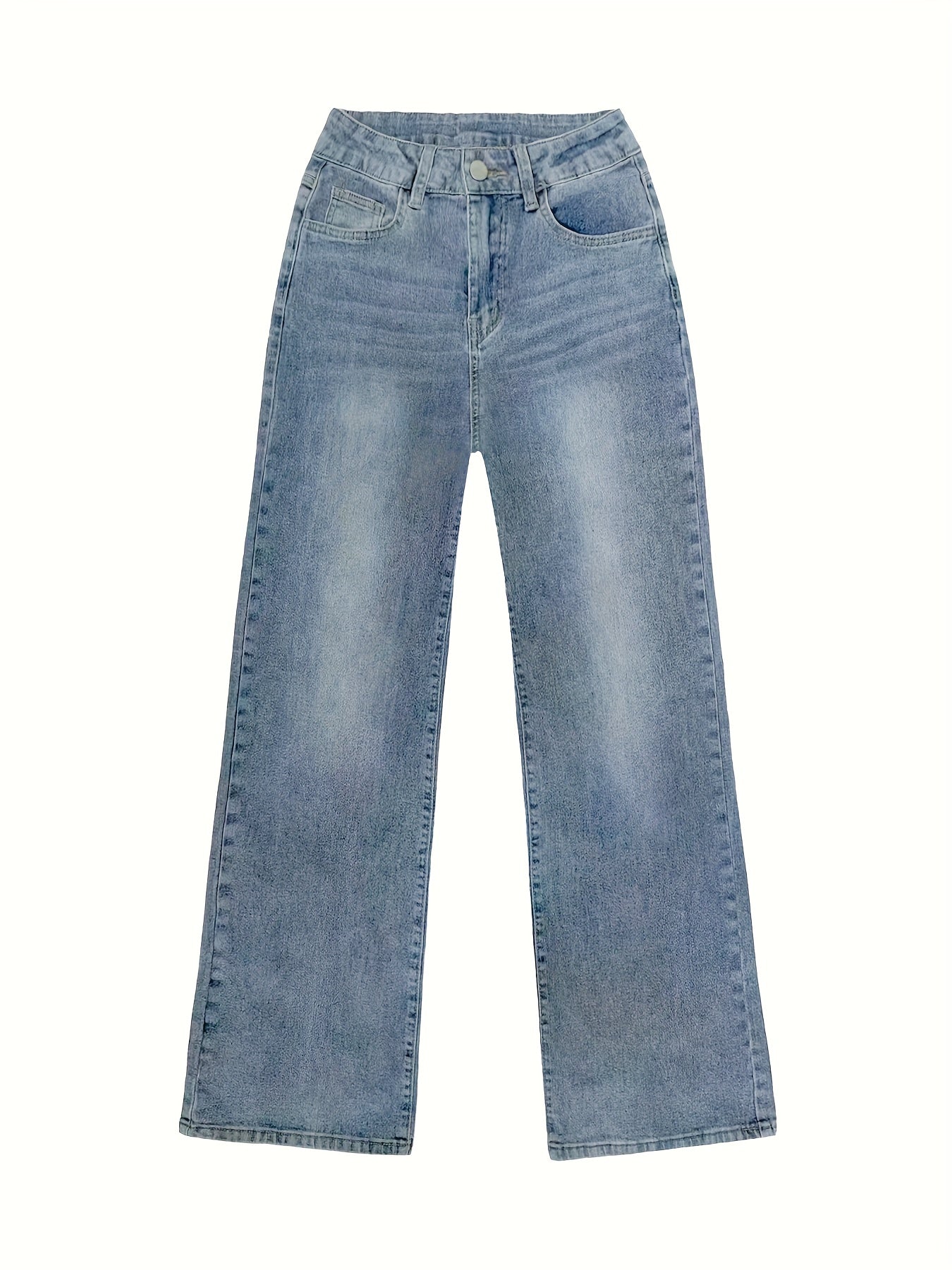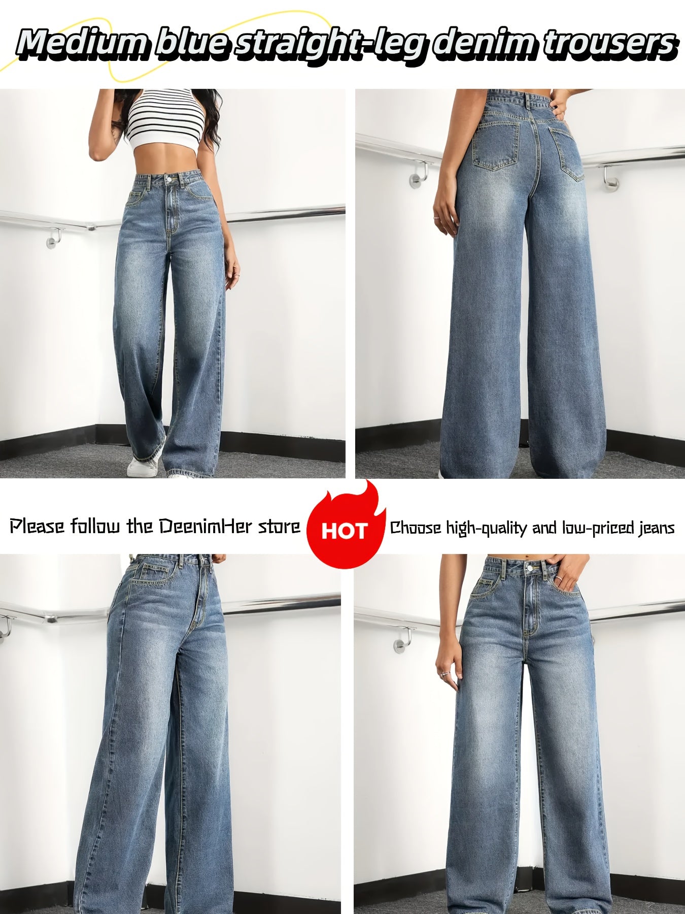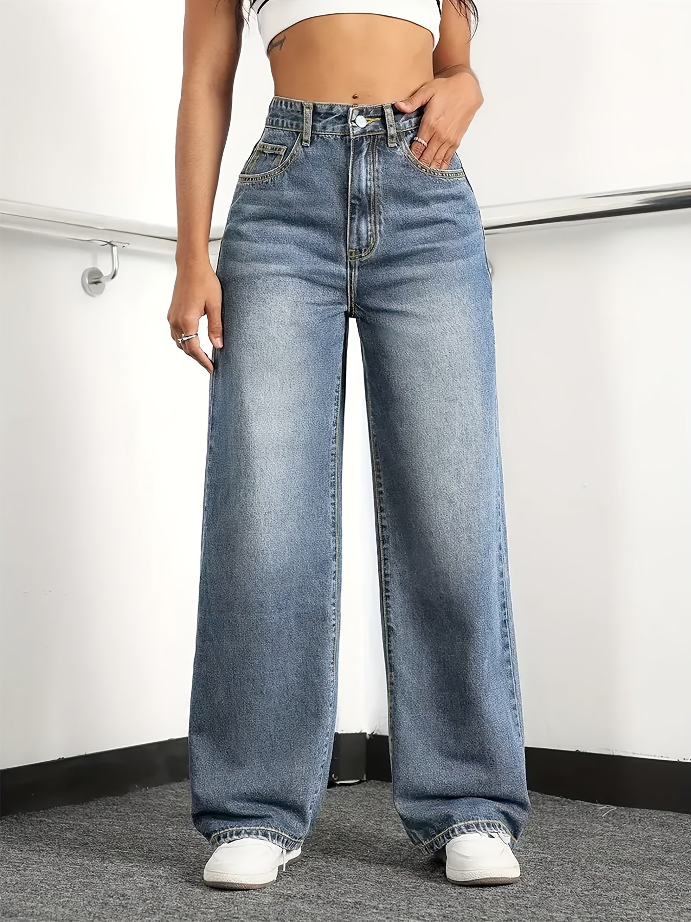 Jean femme taille haute coupe large , en denim doux (65 % coton, 33 % polyester, 2 % spandex) offrant une élasticité moyenne pour un confort optimal.