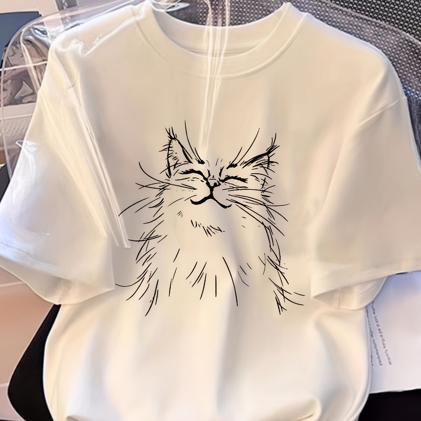 T-shirt femme à manches courtes avec imprimé chat adorable, col rond et coupe ample décontractée. Tissu 100 % coton doux à légère élasticité, parfait pour un look casual toute l’année.
