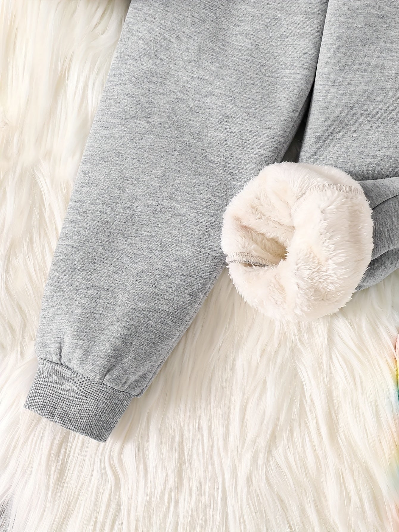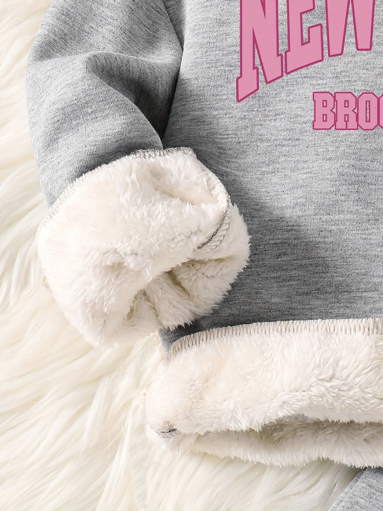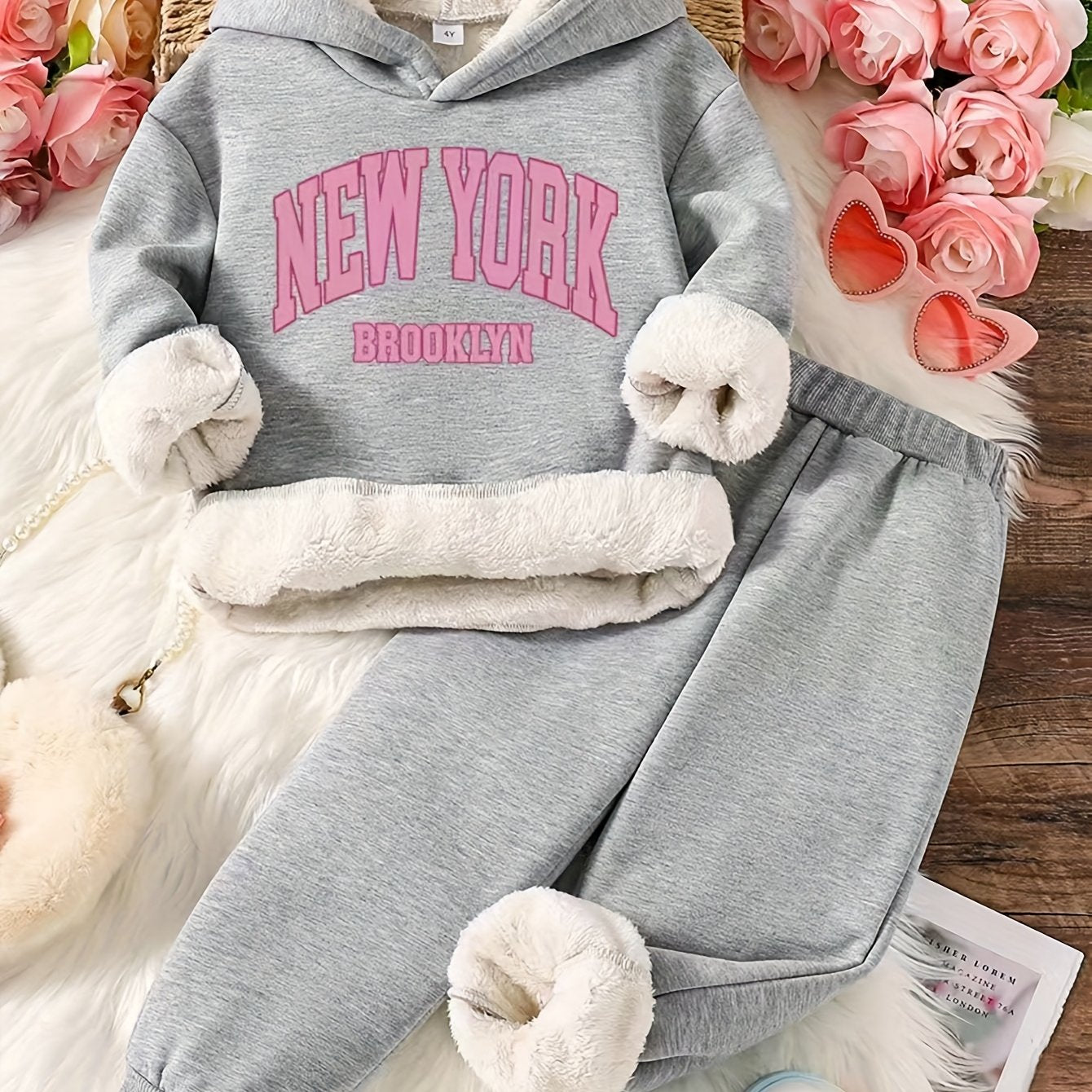 Ensemble 2 pièces chaud pour fille comprenant un hoodie à capuche et un pantalon de survêtement assorti. Tissu thermique à élasticité moyenne, doux et confortable, avec imprimé lettres tendance pour un look décontracté d’hiver.