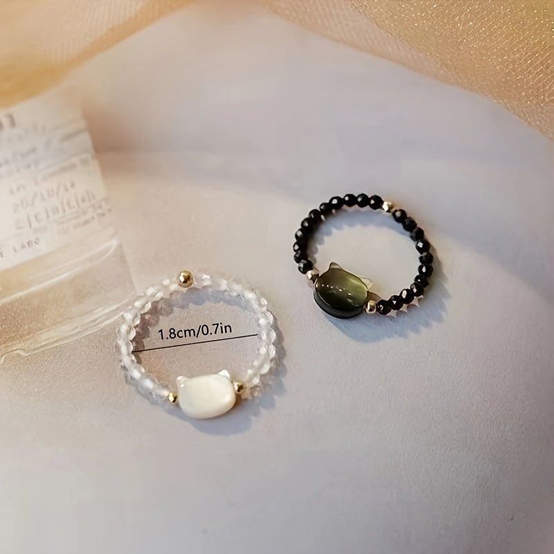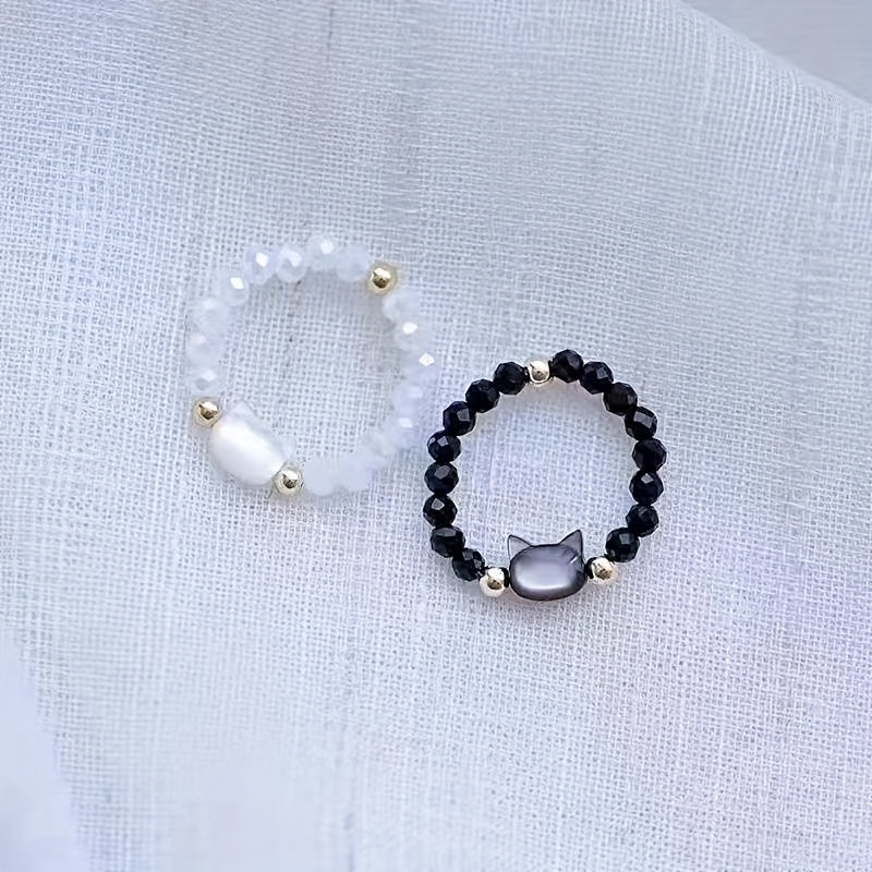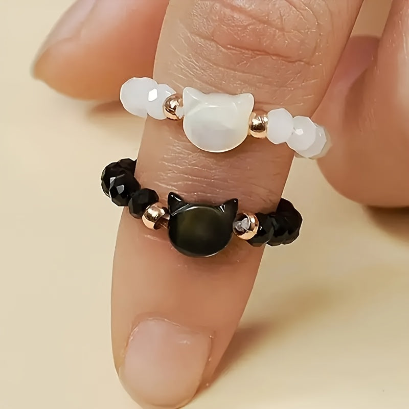 Lot de 2 bagues assorties pour couples/amie, avec perles noires et blanches sur le thème des chats.